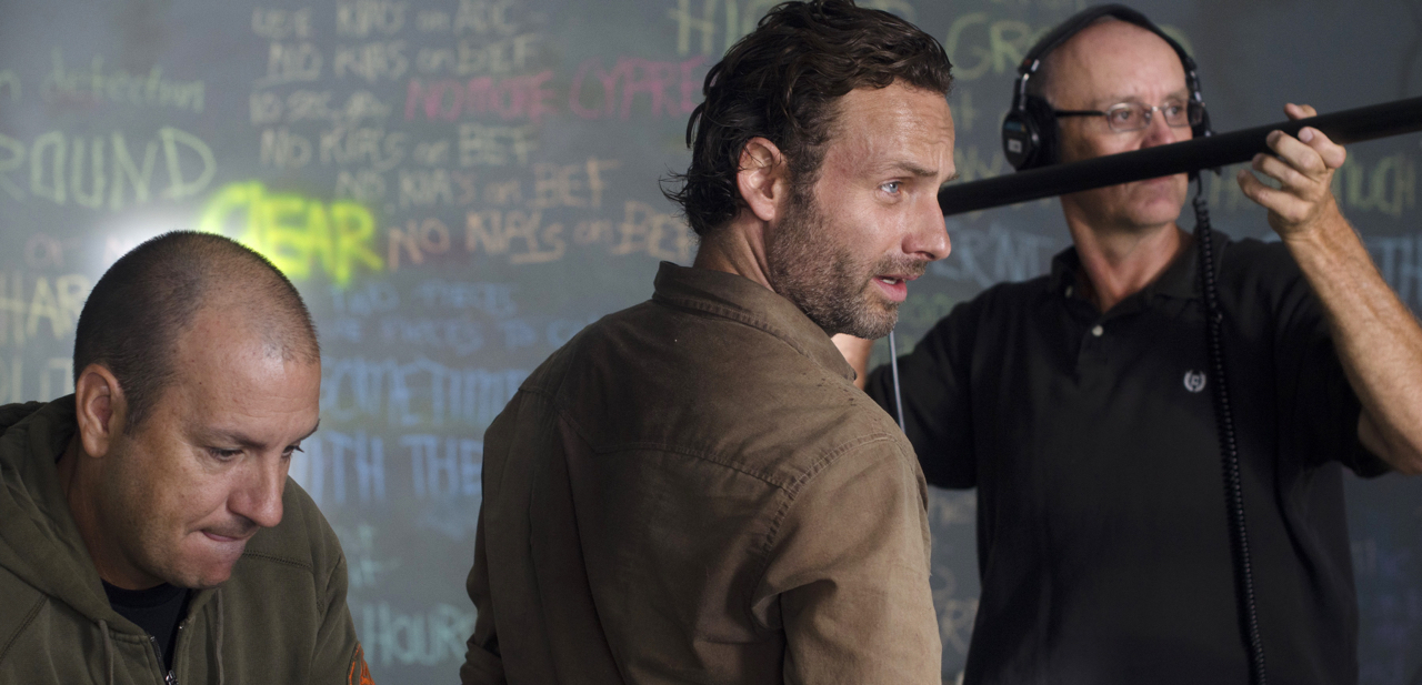 The setting of this TV series is unique in character, in that it takes place in a post apocalyptic world. There is no electricity, no running water, no trains, no planes, a minimal number of cars, but so far, no boats. We do have one obnoxious motorcycle, and usually we can get Norman (Daryl) to get it turned off before he speaks, but sometimes this is just logistically impossible. My point with the post apocalyptic world is that…it’s a quiet world. Now, that may sound like a relief for any sound person, the reality is, there needs to be an extra quiet background ambience. The apocalyptic world should be really quiet, and thus an extra quiet background ambience is needed to maintain the illusion. Well, imagine recording dead quiet tracks in our modern world. Even though we shoot in rural Georgia, we have highways, lots of trains, farm implements, bustling towns, and our studios are right in the approaching pathway of Atlanta Hartsfield International Airport. Remember, “We don’t hold for planes…Roll Sound!”? Yeah, me too. What really makes booming The Walking Dead unique is that the actors roll around, run, shout, yell, fight, whisper, snap their heads from one side to side, kneel, bend over, and swing lots of props (guns, knives, katanas, crossbows, backpacks, hammers, crow bars, bottles, etc.), all in the same set-up. And, they do it amongst trees, vines, creeks, tall grass, railroad tracks, rubble, fences, furniture, etc. Lots of etceteras on this show. This constant activity makes booming the show a unique experience. My leg work has never been more tested. It isn’t unusual to have to start booming from above, go to a side-lined angle, then swing down underneath, and possibly up over the top again. There is a scene in this year’s season where Rick (Andy Lincoln) is confronted by the Governor (David Morrisey) at the prison fence line. Rick was on one side of the fence, and the Governor was 50’ 50-feet away. We used the Governor’s radio mic and I had to boom Rick because he was going to run, fall to the ground, roll around a bus, turn over on his belly and start shooting…all while throwing both scripted and un-scripted lines. Ad libbing is very common on this show! Whispering, then yelling is common on this show…heck, everything that is unexpected is common on this show! The Steadicam operator framed a medium-wide shot over Rick’s shoulder to the Governor who was way up high on a tank. I was over the top on Rick, then he took off running backwards in such a way that I had to sideline him to keep out of the operator’s path and out of the high angle of the direct sunlight. Rick hit the ground shooting, and then rolled around the bus. I had to move laterally around to the other side of the operator. Then Rick rolled onto his belly and shot more. He then sat up and delivered some whispery dialog that required me to go back up over the top. He then shouted, so I had to raise the mic quickly. Then the Governor appeared from around the bus, grabbed Rick and started beating him. I had to race around the operator and sideline the beating. It ended with the operator widening out and framing the on-coming firing troops and a loud tank. The set-up happened very fast, was loaded with stunt movements, a high angle sun, wide shots, tight shots, and rapid panning and tilting. Oh, and did I mention there were 3 three other cameras from 3 three different angles shooting the same thing? This type of set up set-up is common on The Walking Dead.